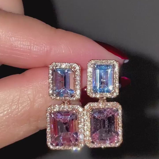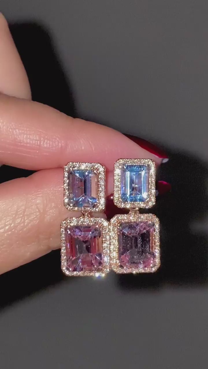 Das exquisite Design von Quince Blossom. Ohrringe aus 18-karätigem Roségold mit insgesamt 7,59 Karat Aquamarin und rosa Morganit sowie 0,78 Karat Diamanten.