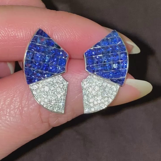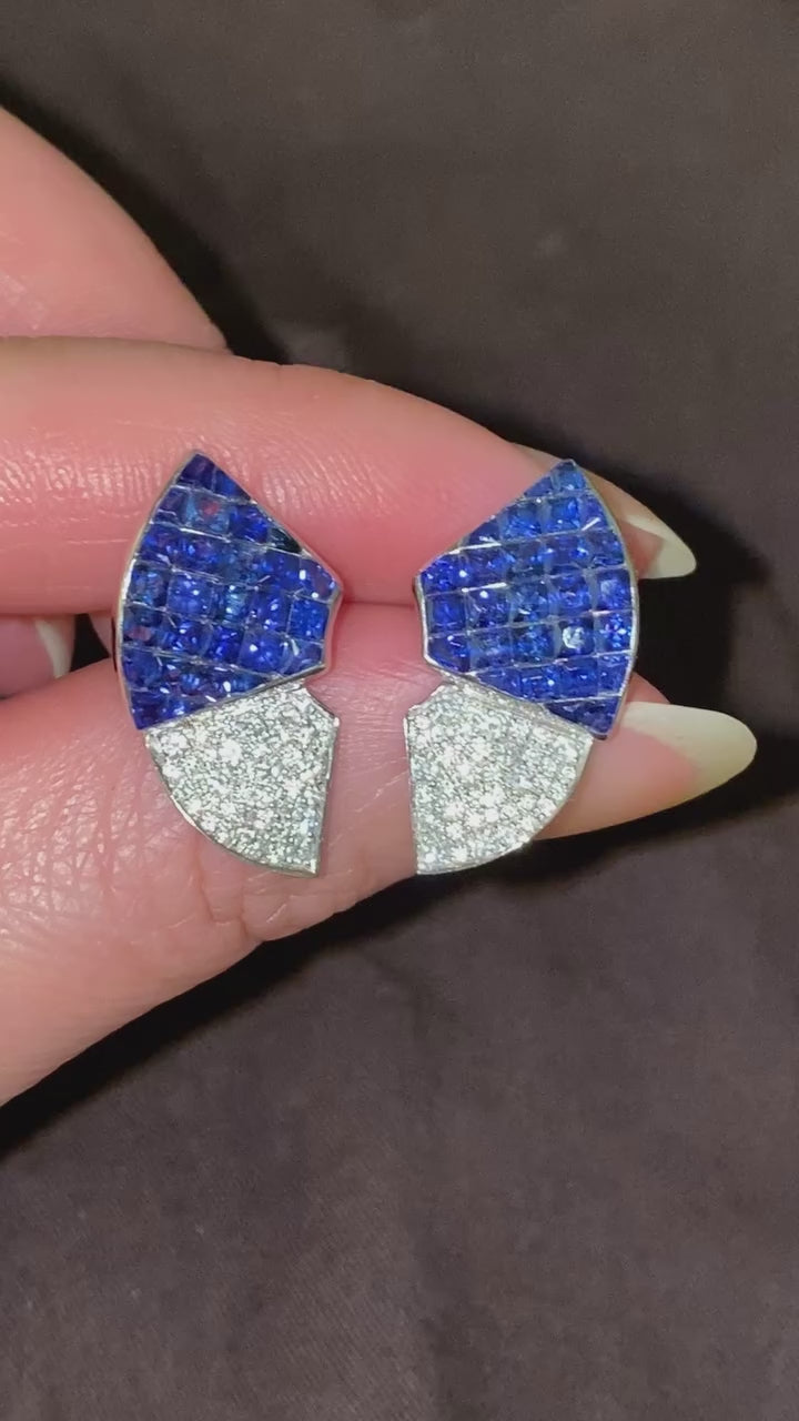 Unsichtbar gefasste, hochwertige Ohrringe mit einem natürlichen, im Prinzessschliff geschliffenen blauen Saphir und Diamanten in 18-karätigem Gold von Quince Blossom. Blaue Saphire: 2,34 ct / Diamanten: 0,55 ct.