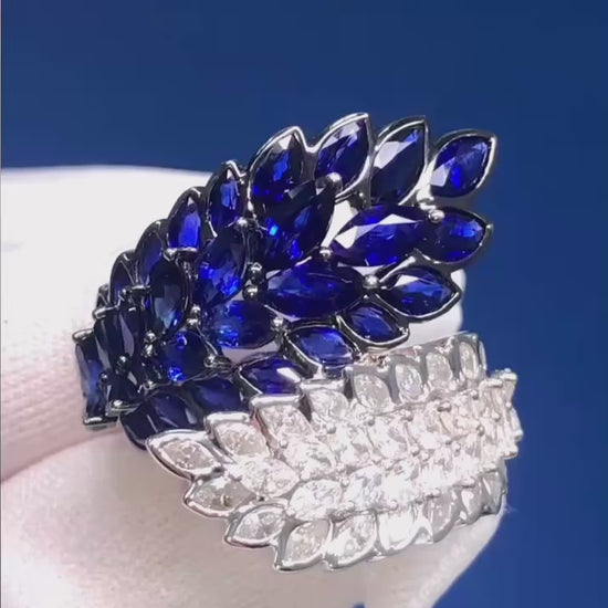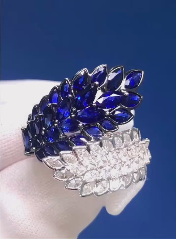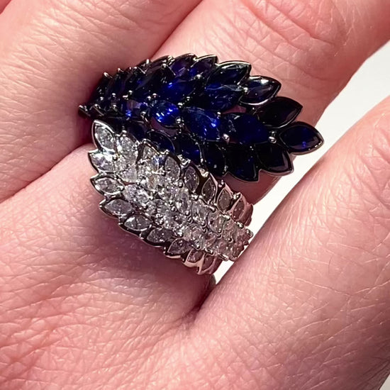 Anello unico nel suo genere con diamanti naturali e zaffiri in oro 18 carati.